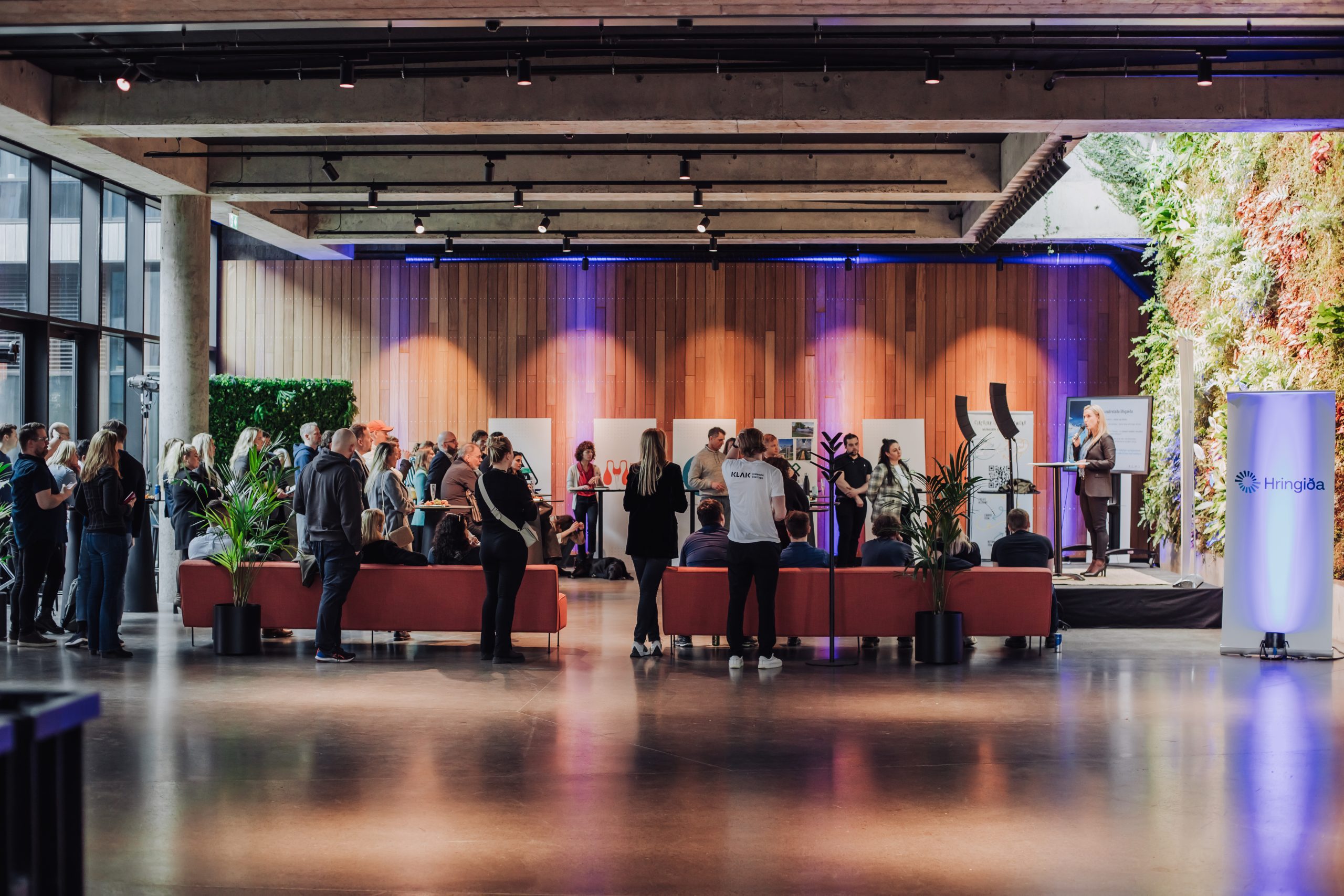 KLAK and the business accelerator Hringiða took advantage of the happiness and invited everyone to a Prosecco & Pitch day for the first day of summer at the famous green wall in Gróska, where investors, thirsty startups and the public listened to elevator pitches from start-up companies in Hringiða.